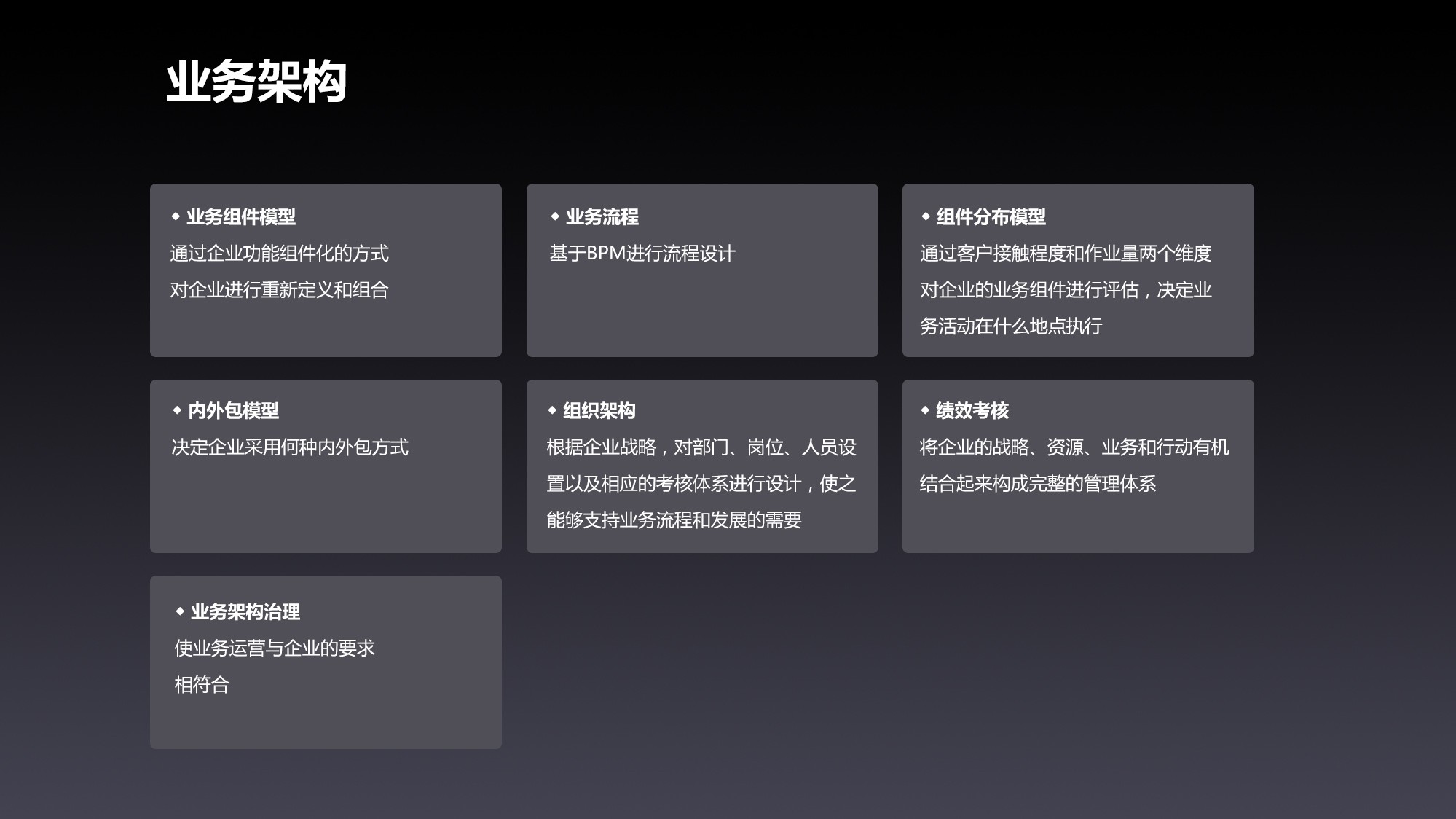 業(yè)務(wù)架構(gòu)從企業(yè)高層視角,“智匯”助力領(lǐng)導(dǎo)者、董事會(huì)與股東,借ARC - BSC平衡計(jì)分卡系統(tǒng)等決策層工具,清晰洞察運(yùn)營(yíng)計(jì)劃、價(jià)值與挑戰(zhàn),精準(zhǔn)錨定戰(zhàn)略方向。在業(yè)務(wù)模式重塑上,以業(yè)務(wù)組件模型為抓手,通過(guò)企業(yè)功能組件化的方式,對(duì)企業(yè)進(jìn)行重新定義和組合,聯(lián)動(dòng)“數(shù)盈”數(shù)據(jù)資產(chǎn)運(yùn)營(yíng)等服務(wù),打破傳統(tǒng)邊界,構(gòu)建契合戰(zhàn)略的全新業(yè)務(wù)運(yùn)營(yíng)模式 。
